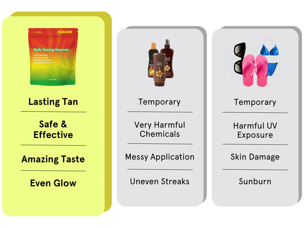 Our gummies are designed to boost your skin's resilience to sun exposure, helping you tan faster and more effectively from the inside out!